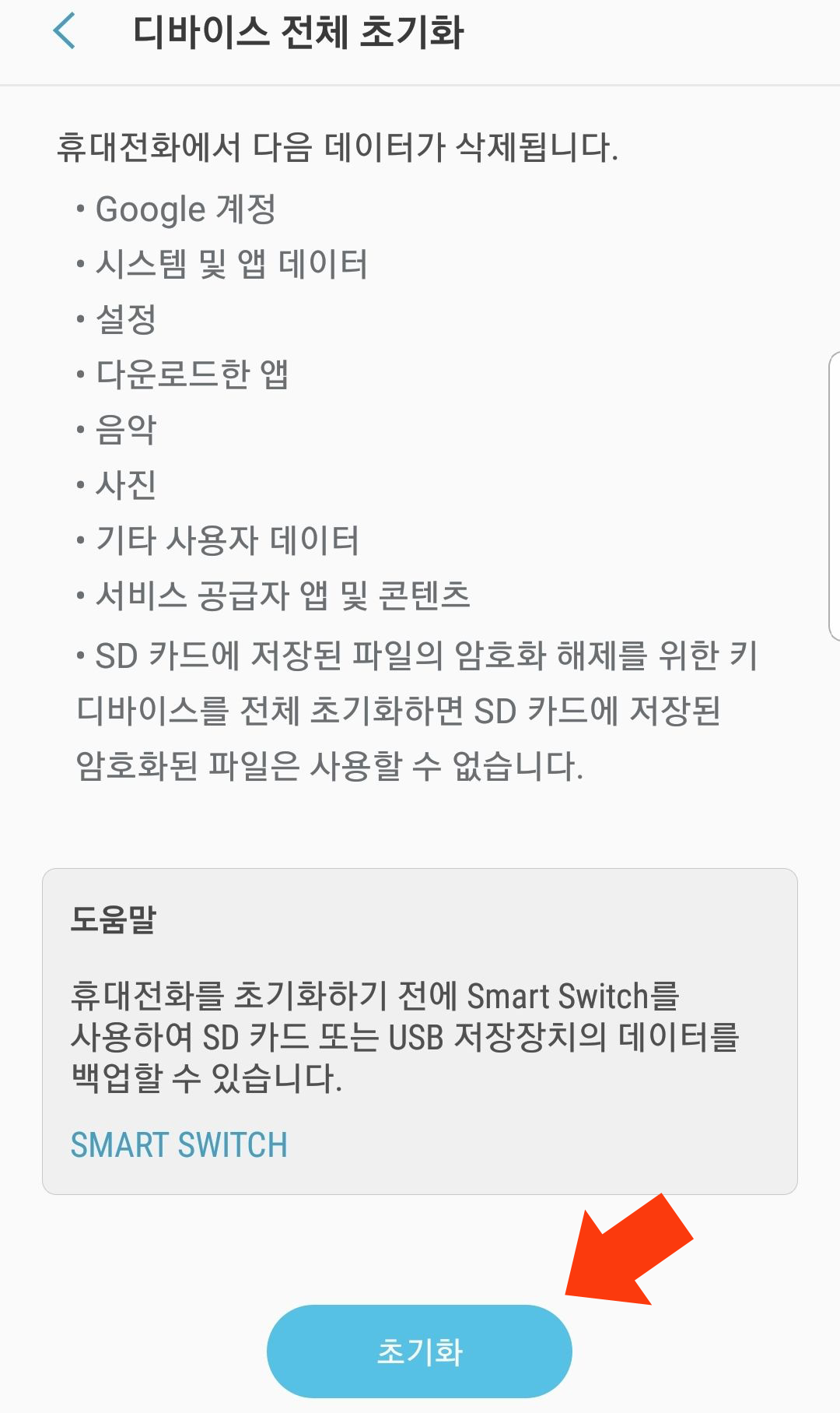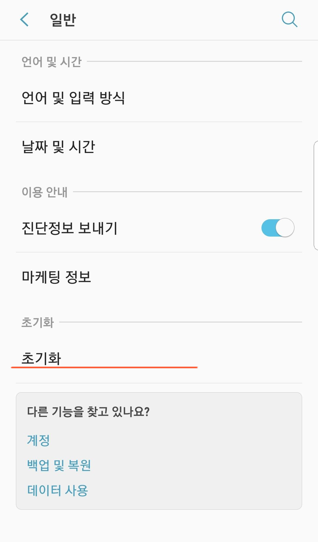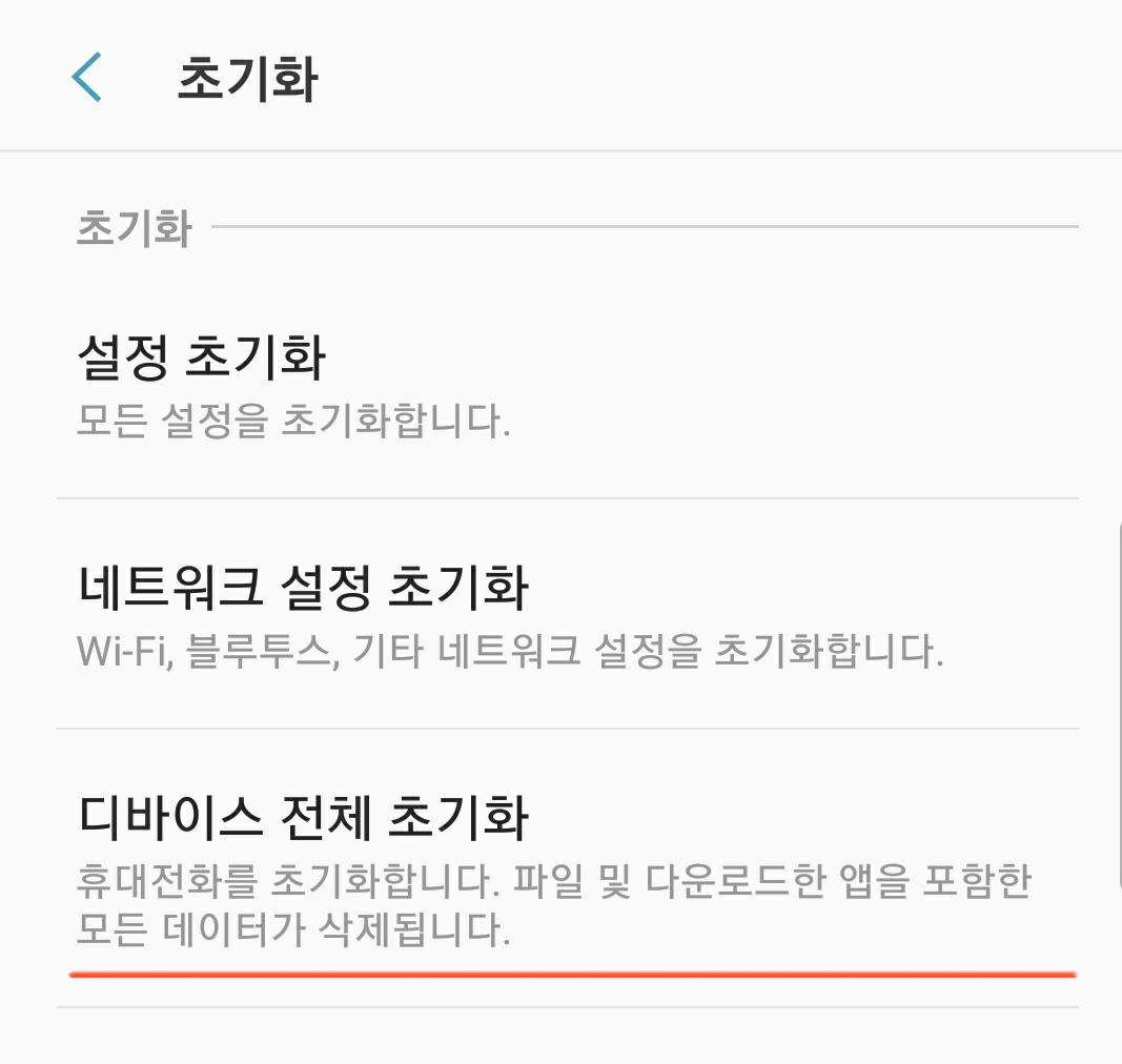 전원을 끄고 "홈 + 볼륨 + 전원" 키를 동시에 5~10초 간 꾹~ 눌러줍니다. 잠시 기다리면 파란색 바탕에 안드로이드 로봇이 나오며 갤럭시 s7 엣지 공장초기화 모드(검정 바탕에 영어..)로 진입합니다. 그리고 아주 작게 영어가 보이실 텐데요"볼륨 키"를 이용해 "wipe data/factory reset"로 이동 후 "전원 키"를 눌러주시면 화면이 넘어가고 "yes"를 선택 후 "전원 키"을 다시 한번 눌러 주면 초기화가 진행됩니다.