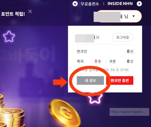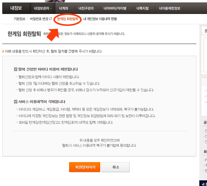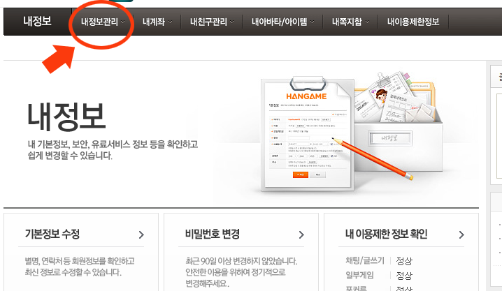 본인의 아이디를 클릭하여 "내 정보> 내 정보관리> 한게임 회원탈퇴"로 이동해줍니다.