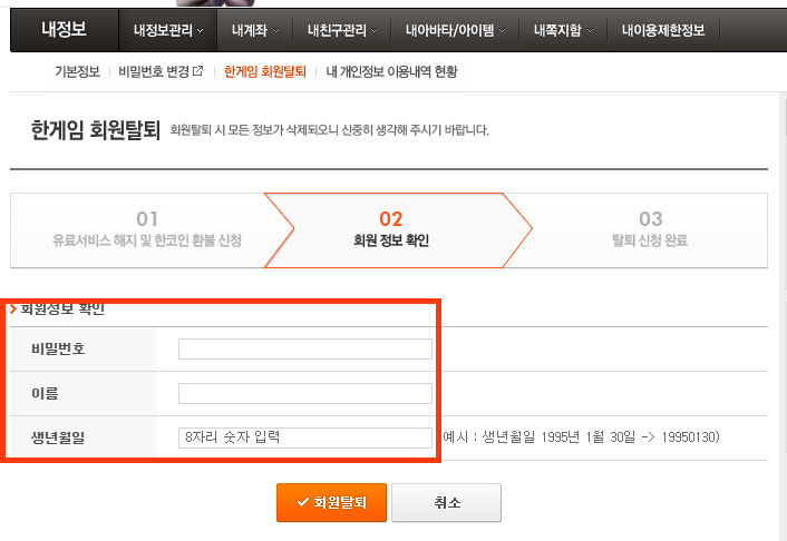 회원정보 확인, 비밀번호와 이름, 생년월일 기입 후 "회원 탈퇴"눌러주시면 신청이 모두 완료됩니다.