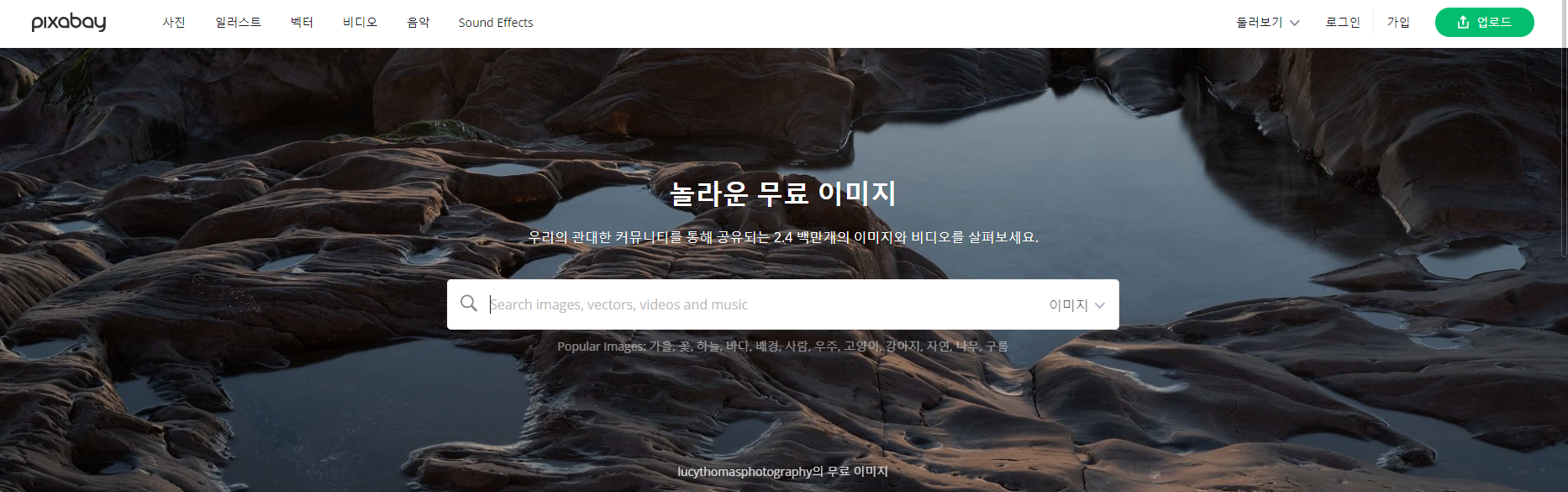픽사베이는 Unsplash와 다르게 사진, 동영상, 음악, 일러스트, 백터 등을 지원한다. 또한 한글 검색이 가능하고 사이트 자체 내에서 언어 변경이 가능하므로 아주 편리하게 이용할 수가 있다.