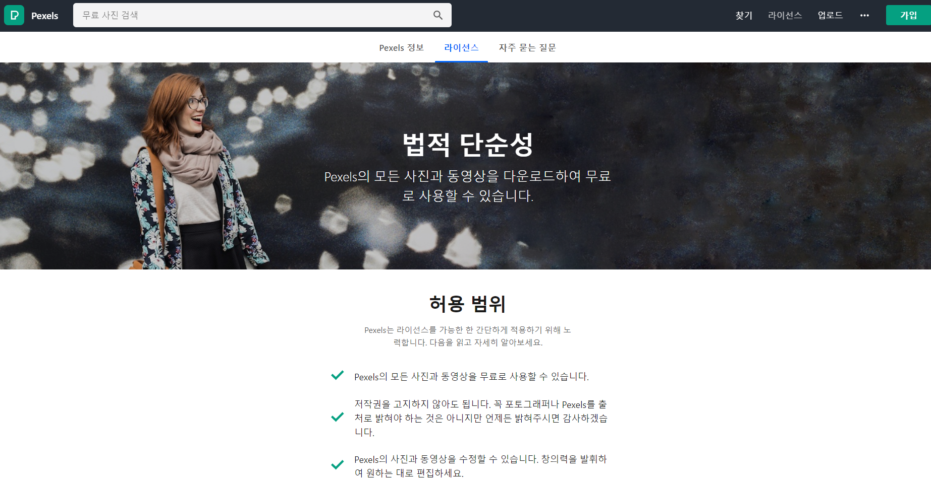 pexels는 주로 인물사진과 동영상을 지원한다. 감각적이면서 깔끔한 고퀄리티의 사진이 특징, 한글 검색과 언어 변경이 가능하다.
