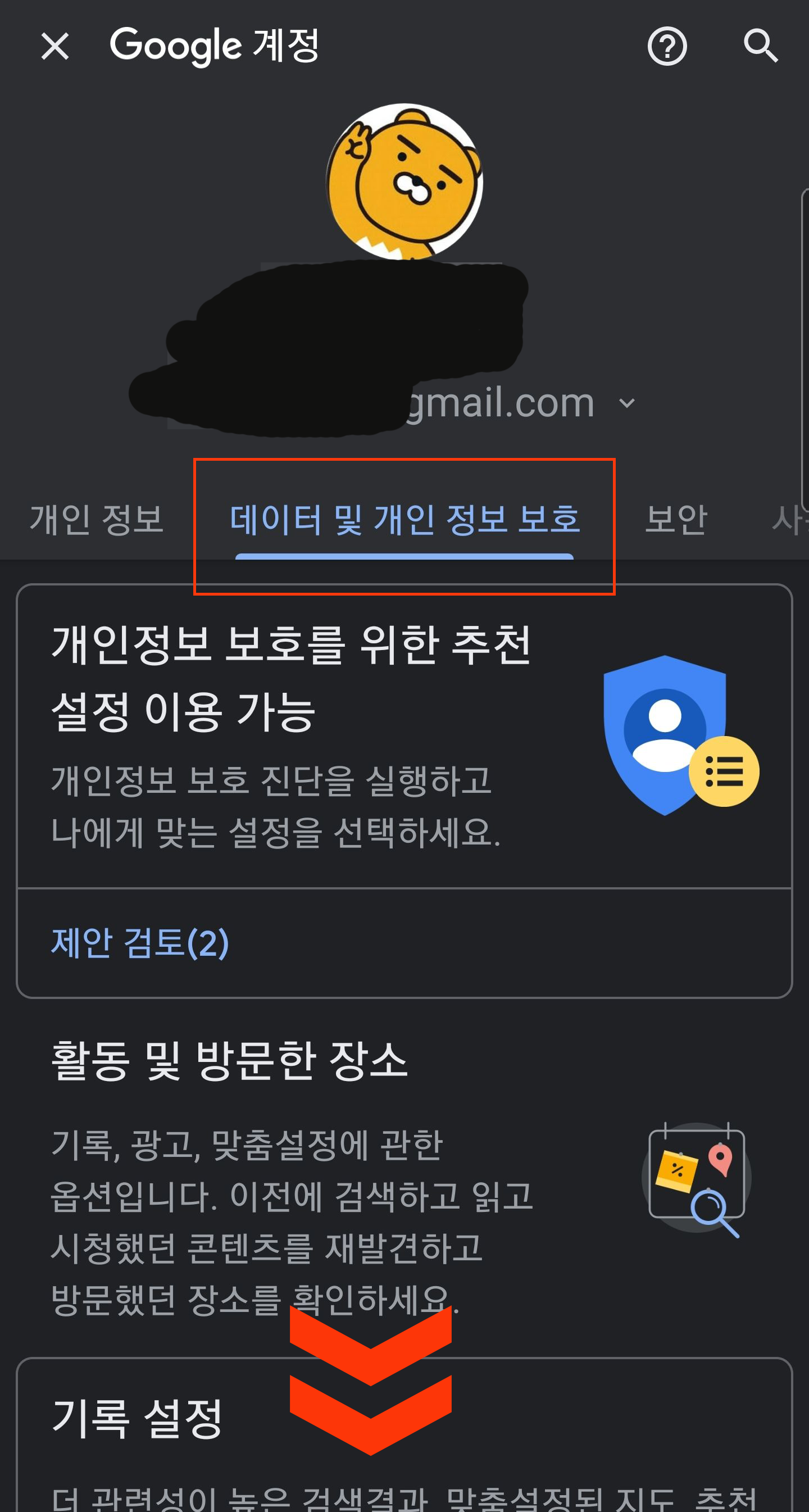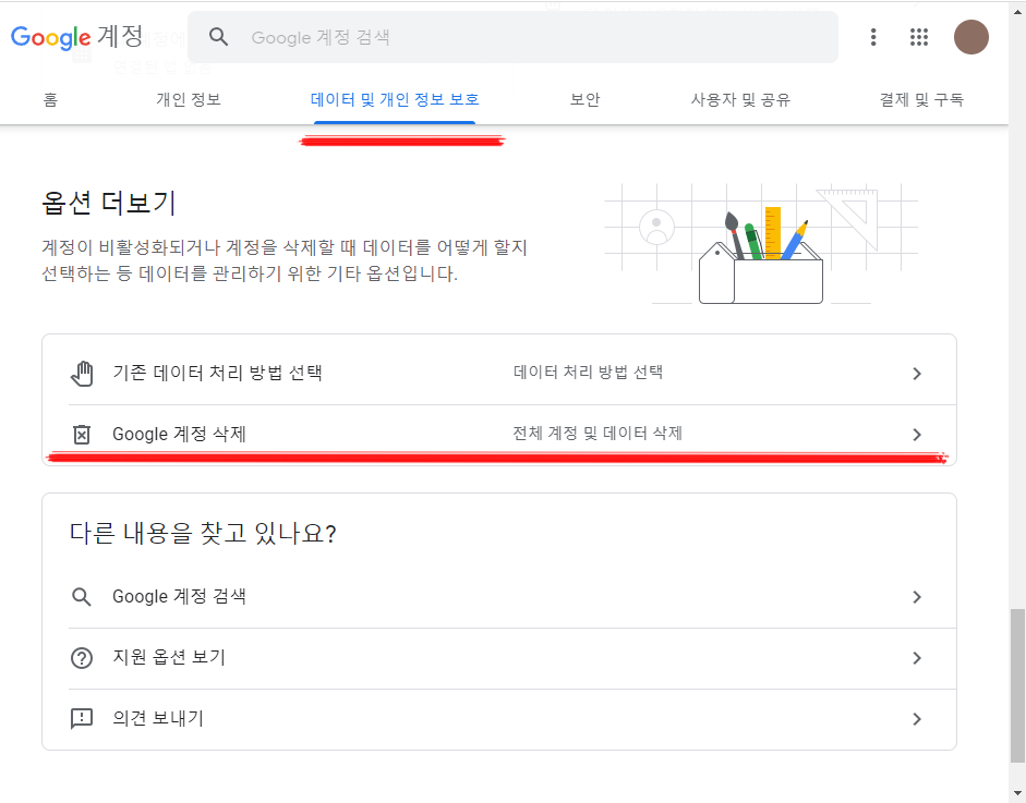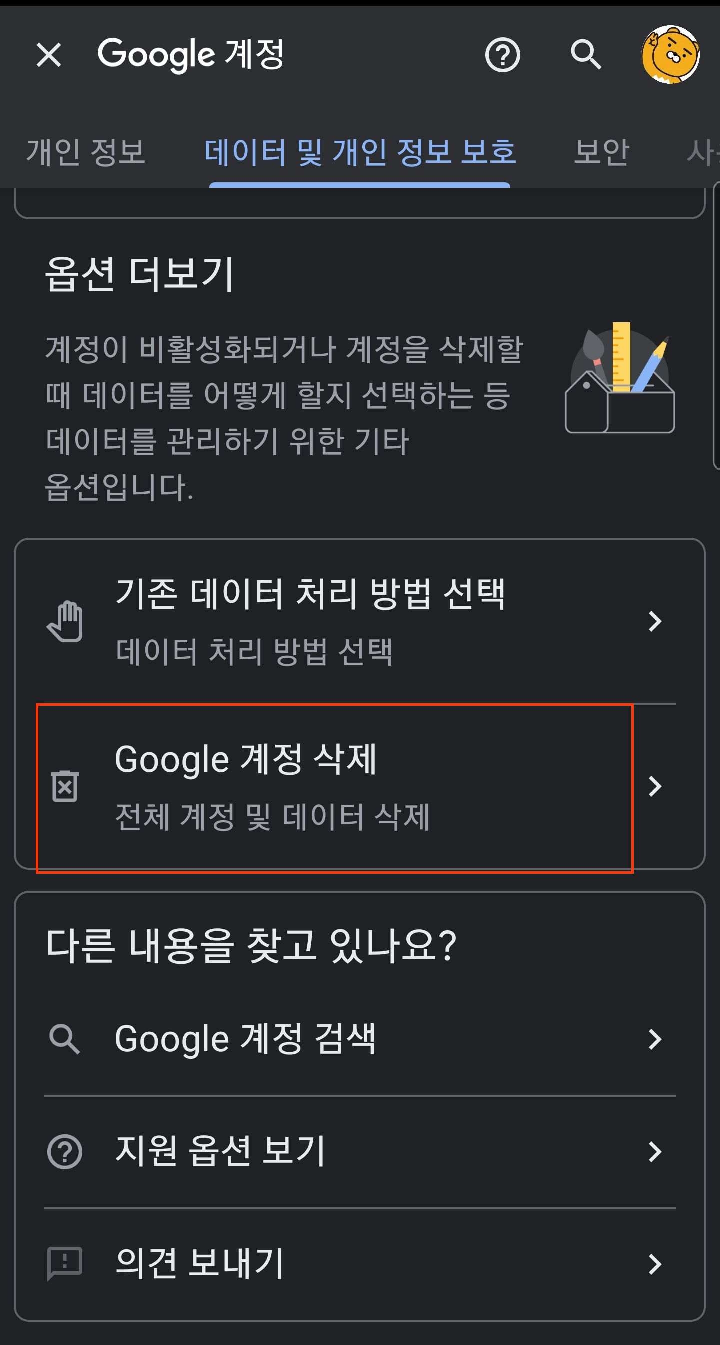 왼쪽 혹은 위쪽에 "데이터 및 개인 정보 보호"를 누르고 화면 이동 후 쭉 내리면 옵션 더보기 "전체 계정 및 데이터 삭제" 이 있습니다.