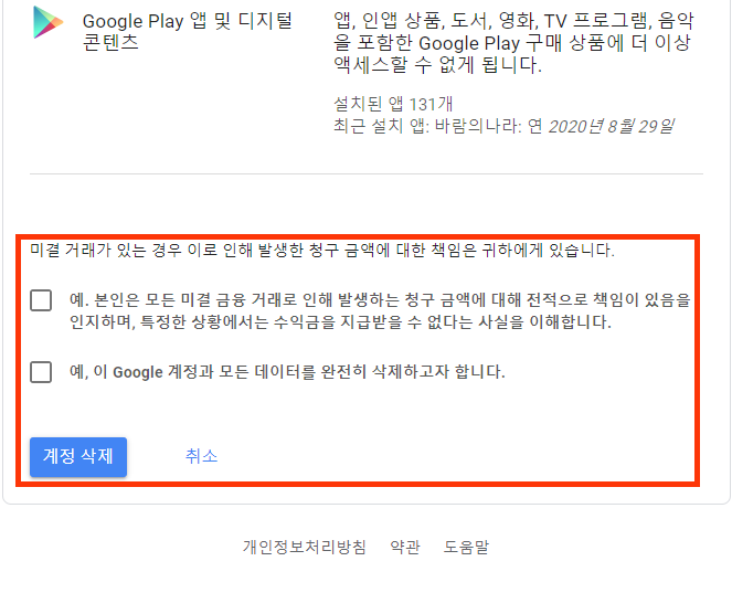 마지막으로 이 구글 계정과 연동된 모든 정보가 나옵니다. 체크 표시하고 계정 삭제하시면 됩니다. 필자는 게임용 계정이었기 때문에 앱이 131개네요 바람의 나라 연, 2020년 8월 29일이 마지막 설치일이군요.. ㅎ;;